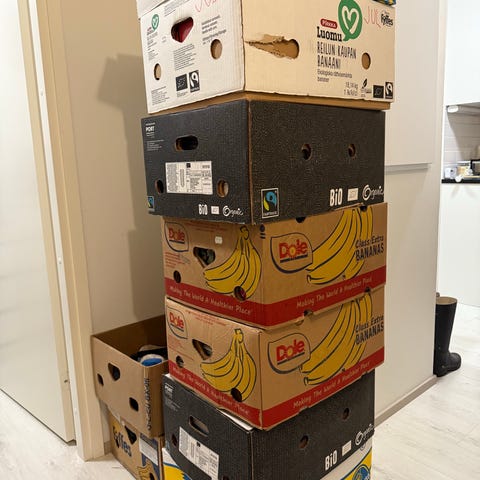 Toivotaan nopeaa noutoa muuttolaatikkoina olleille banaanilaatikoille (nyt 9 kpl) ja Iisi-muuttolaatikoille (6 kpl)