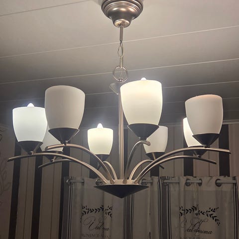 Näyttävä hopea glitterinen varjostin, jonka halkaisija 44cm. Kokonaiskorkeus 55cm (ylimmästä lautasesta mitattuna). Säädettävä korkeus ja pistoke liitäntä myös tässä.