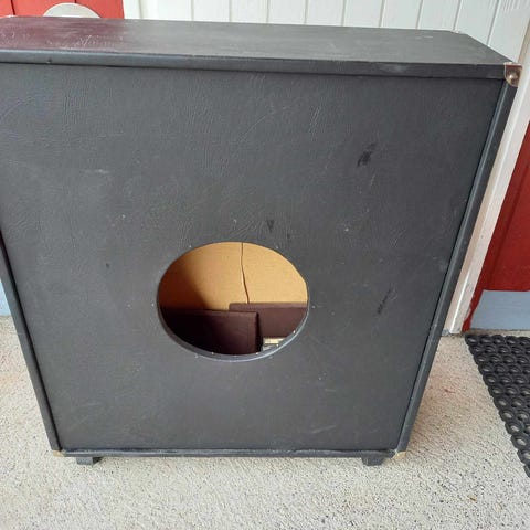 Itsetehty, tukeva kaappi 12" kaiuttimelle. Mitoissa otettu mallia Deluxereverbistä, 62x21x43 cm.