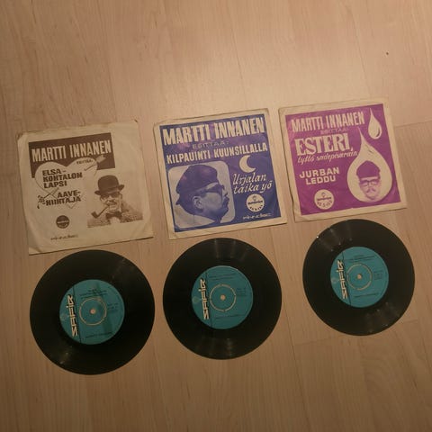 Hyväkuntoinen, ei naarmuja, Martti Innasen vinyylilevy, "Elsa kohtalon lapsi" ja "Aavehiihtäjä".