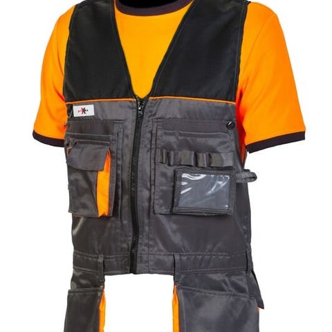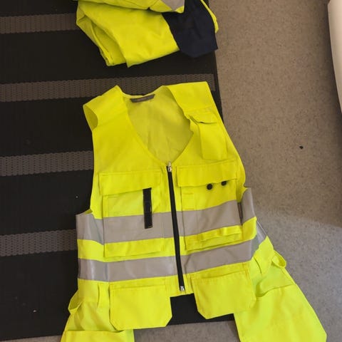 85% polyesteri, 15% puuvilla, satiini, 300g/m². Yksisuuntainen muovinen vetoketju listan alla. Läpälliset rintataskut, joista toisessa puhelintasku ja toisessa kynätasku. Tarralla suljettavat etutaskut. Tarranauhalla säädettävä helma. 50 mm leveät. Heijastimet hartioilla ja vartalon ympärillä