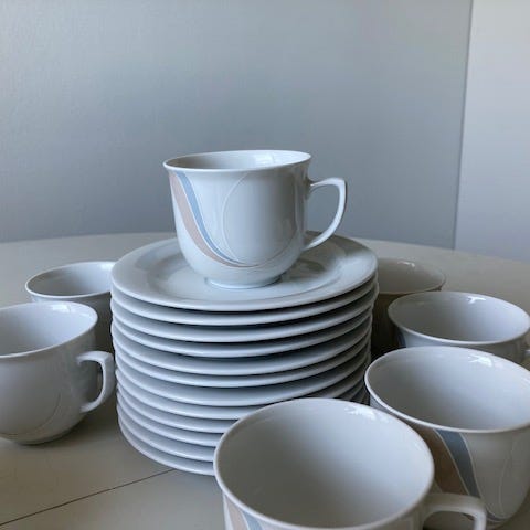 Myydään 6 kpl Bavarian posliinikahvikupit ja aluslautaset. Aluslautasten halkaisija 11 cm.
