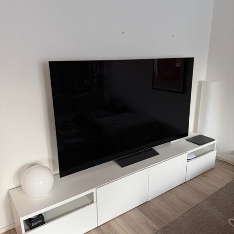 Korkeakiiltokaapinovet, vaaleaksi petsattu tammikuvio. Taakse tehty itse muutama siisti johdonaukko.