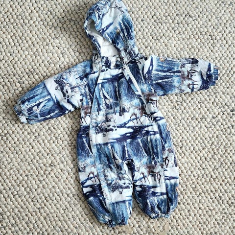 H&M vauvan unisex toppahaalari, koko 68. Väri sininen, päällikangas polyesteriä. Haalarissa on huppu ja pitkät hihat. Sisäpuoli on pehmeää, karvamaista vuorimateriaalia, joka tuo lisälämpöä. Sopii vauvalle ulkoiluun ja vaunukäyttöön viileämmällä säällä.