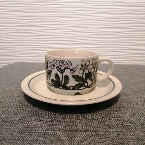 Arabia Flora kahviastiasto kukkakuvioitu kerma- ja espressokupit lautasineen