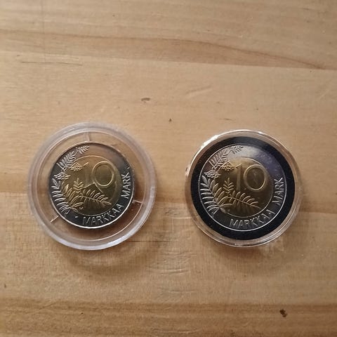 Mukaan myös muutama seteliä, muistojani markka ja kolikoiden laskuun ja lajitteluun sopivat muoviset telineet.