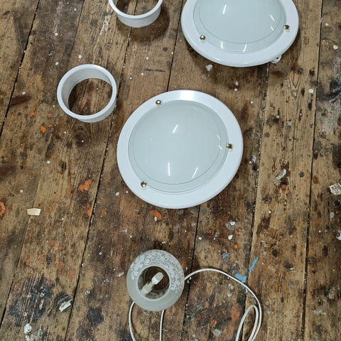 Kaksi pöytävalaisinta samaa sarjaa, toisessa johto hieman rikki mutta korjattavissa, näkyy kuvassa