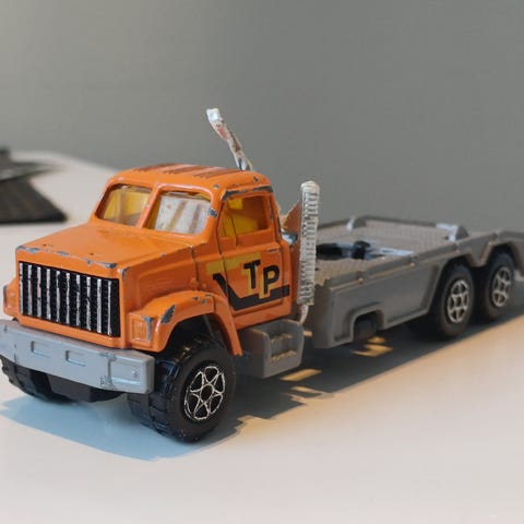 Lesneyn betonimyllyauto. Metallirunkoinen, oranssi kuorma-auto, jossa on pyörivä betonimyllyn säiliö ja kuusi kumimaista rengasta. Sopii leikkiautoksi tai kokoelmaan.
