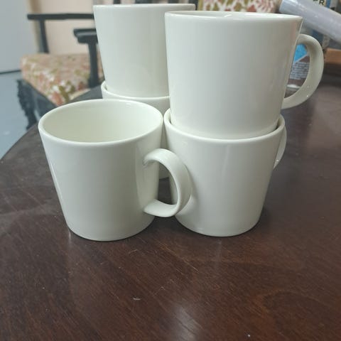 5kpl valkoista Iittalan Teema mukia. Satunnaisessa käytössä ollut, mutta kaikki hyvässä kunnossa eikä tahroja tai tummumia missään.