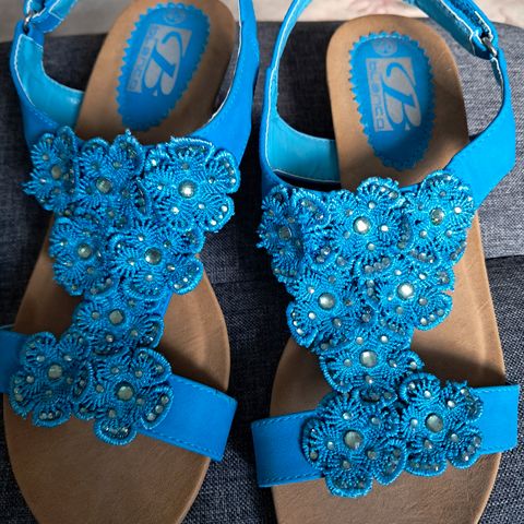 Kauniit uudenveroiset sandaalit, koko 42., sopii hyvin koolle 41-42 Sandaaleissa on turkoossisiniset, kiiltävät remmit ja ruskea pohja. Avoin malli, jossa ohuet ristiin menevät remmit ja nilkkaremmi soljella.