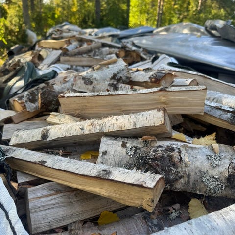 33 cm mäntyklapia 1 m3 säkissä. Tehty keväällä 2025. Nouto Murrosta, nostan säkin kyytiin.