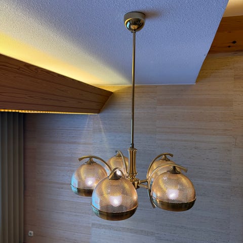 Klassinen kattovalaisin, jossa on koristeelliset metalliosat ja valkoinen lasivarjostin.Valaisimen tyyli on klassinen, ja se sopii hyvin perinteiseen sisustukseen. Sen muotoilu on ajaton ja elegantti.Valaisimessa ei ole näkyviä vaurioita tai kulumia.