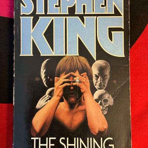 Kauhuklassikko The Shining kovakantisena 1985 painoksena. Sivujen reunoissa kellertymää muuten täysin pirteä ulkonäöltään.