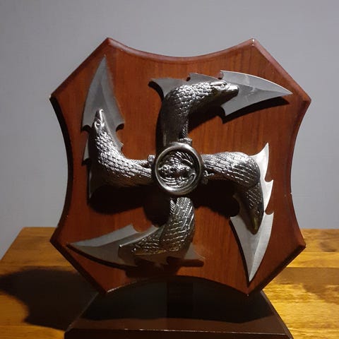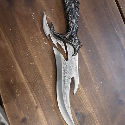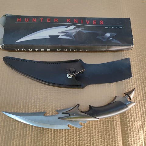 Emblazon of Knife koristeveitsi, metallinen aaltoileva terä ja koristeellinen kahva luurankoaiheella. Veitsi toimitetaan muotoillussa kotelossa ja alkuperäisessä rasiassa. Sopii esimerkiksi keräilyesineeksi tai sisustuselementiksi. Veitsen pidikkeet, jotta veitsi pysyy mustassa taustassa hävinneet mutta näppärä sorminen saa siihen helposti uudet laitettua.