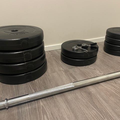 Fysioline pump -setti. Levytanko + painot: 2x5kg, 2x2,5kg, 2x1kg. Hyväkuntoiset.
