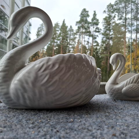 Myydään 2 kpl posliinijoutsenia, toisen korkeus 21 cm ja toinen 13,5 cm. Yhteishinta 18 euroa.