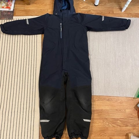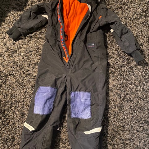 Polarn O. Pyret lämmin haalari, koko 128. Väri musta, sisäpuolella oranssi vuori. Kulumaa on saumoissa, polvet paikattu vahvalla kankaalla. Soveltuu lapsen ulkoiluun ja leikkeihin erilaisissa sääolosuhteissa.