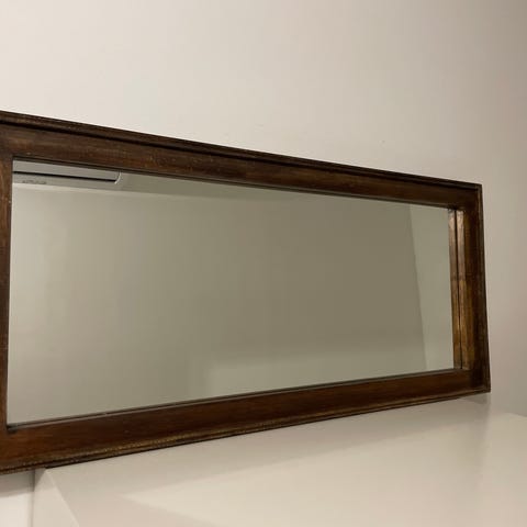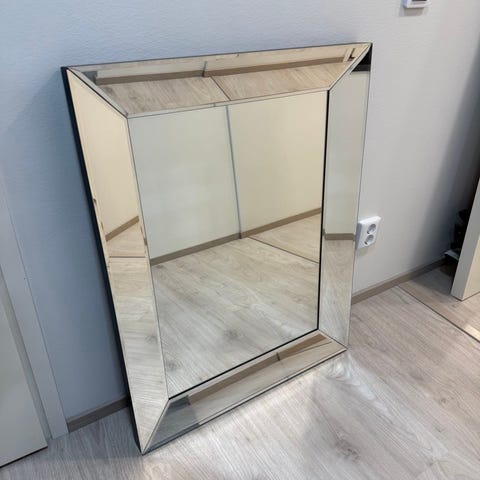 Peili, jossa suorakulmainen muoto ja käsintehty rautakehys. Kiinnitys seinälle kahdella ruuvilla. Koko k 105, l 90 cm.