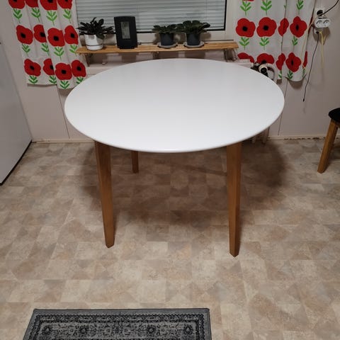 Pyöreä ruokapöytä valkoisella MDF-pöytälevyllä ja massiivipuisilla jaloilla. Puu on lakattu, mikä tekee siitä kestävämmän. Ø105 x K75 cm