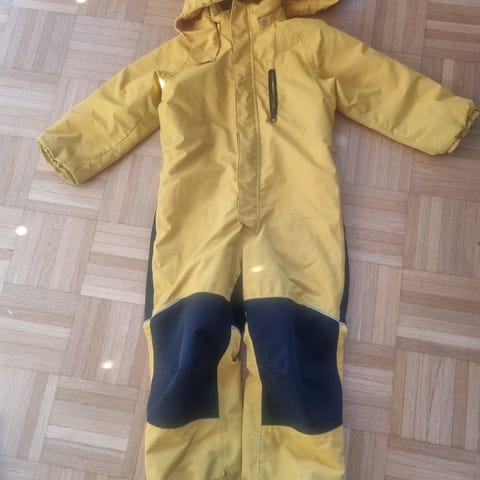 Haalarissa on huppu, vetoketjukiinnitys ja neppilista. Edessä vetoketjutaskut. Lahkeissa heijastinyksityiskohtia. Polvessa paikkaus ja kankaassa näkyvissä kulumaa, samoin joissakin saumoissa ja pinnassa käytön jälkiä. Soveltuu esimerkiksi ulkoiluun ja leikkeihin sääolosuhteista riippuen.