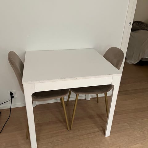 Valkoinen Jyskistä ostettu ruokailuryhmä neljällä pinnatuolilla. Pöydän kansi hieman kulunut, mutta vielä käyttökelpoinen. Yhdessä tuoleista pinna haljennut ja se korjattu. Maksu käteinen.