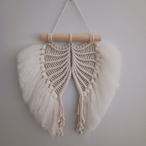 Makramee enkelinsiivet, väri puhdas valkoinen. Työn leveys 38cm ja korkeus 56cm.