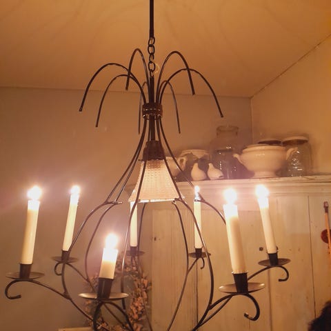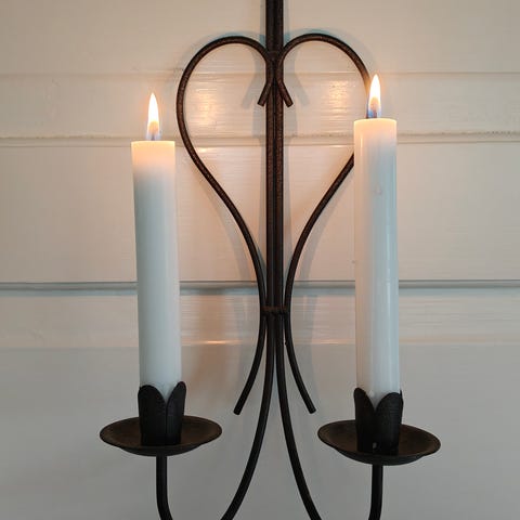 Tumma sävyltään, ehkä vähän kupariin vivahtava kynttelikkölamppu. Voi käyttää lasikuvuilla tai ilman.