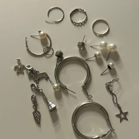 Setti sisältää: 2 x rengaskorvakorut, nappikorvakorut, riipuskorvakorut, sormus, 2 x rannekoru + halutessa mukaan musta nahkainen rannekoru, josta huomasin kiinnitystapin irronneen.