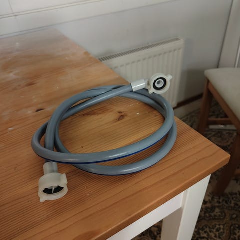 Pesukoneen pitkä ottovesiletku ja pidike.