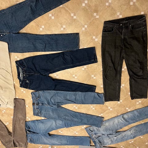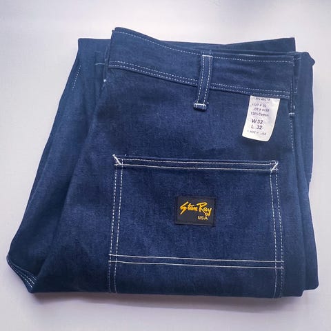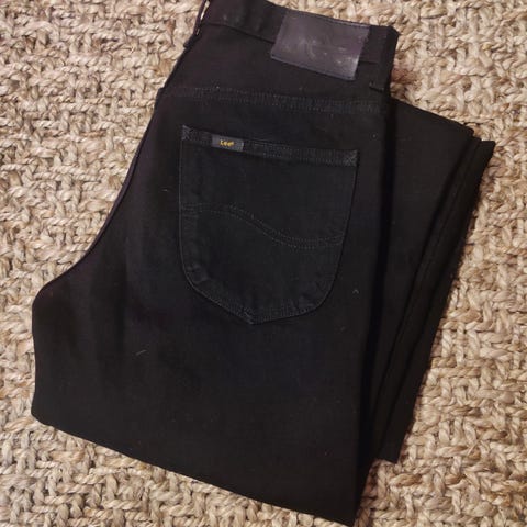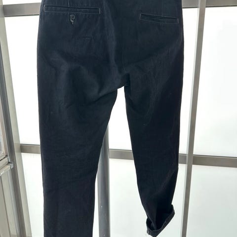 Kevyestä duck-kankaasta Italiassa valmistetut Leen farkut. Oikean reiden kupeella pieni tasku. Koko W30L32. Suora workwear leikkaus. Pesulapussa sanotaan, että pitäisi puhdistaa ainoastaan kuivapesulla, mutta kyllä nämä ovat hyvin kestäneet tavallisen 40 asteen pesuohjelman.