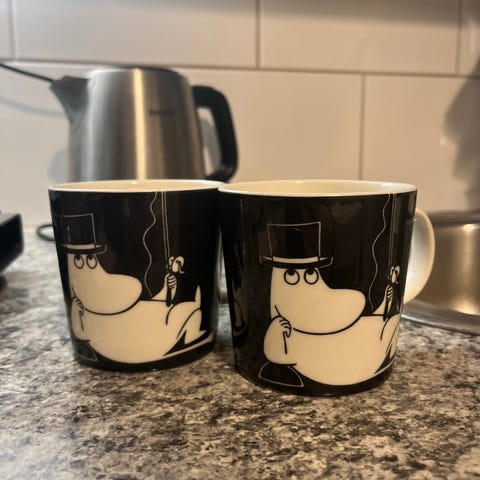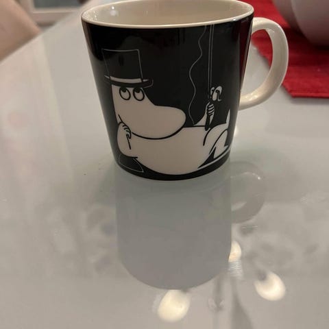 Tarralliset, kaapissa säilytetyt muumipappa muki ja lautanen. Hinta yhteensä 65e.