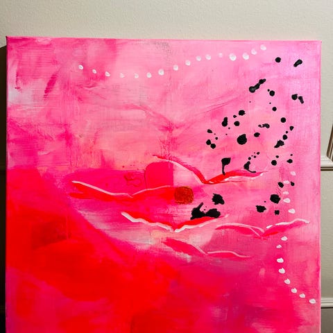Teoksessa on useita kirkkaita ja pastellisävyisiä värejä, kuten pinkkiä, oranssia, keltaista, vihreää, sinistä ja violettia.