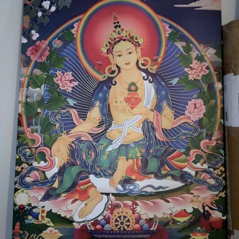 Annetaan Valkoinen Tara thangka- reproduktio. Huom! Kyseessä siis vain kangas, johon tulostettu kuva. Ei kehyksiä, voidaan pingottaa esim.puukehyksiin.
