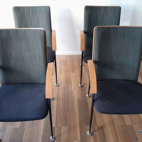 Jämäkkiä asiakas-/julkitilatuoleja käsinojilla 4 kpl. Jonkun verran kulumaa kankaissa mutta ehjiä.