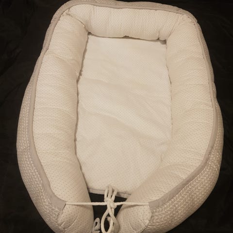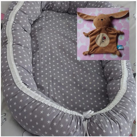 Vauvapesä, jossa pehmeä reunus ja kiristettävä nauha jalkopäässä. Kuosissa on metsän eläimiä, kuten peuroja ja norsuja, vaalealla pohjalla harmaan, ruskean ja vihertävän sävyissä. Mukana on samaa kuosia oleva pehmustettu peitto tai alusta. Soveltuu vauvan nukkumis- ja lepoalustaksi esimerkiksi sängyssä, sohvalla tai matkasänkynä. Materiaali vaikuttaa olevan pehmeää kangasta ja täytteenä on vanua tai vastaavaa pehmustetta.