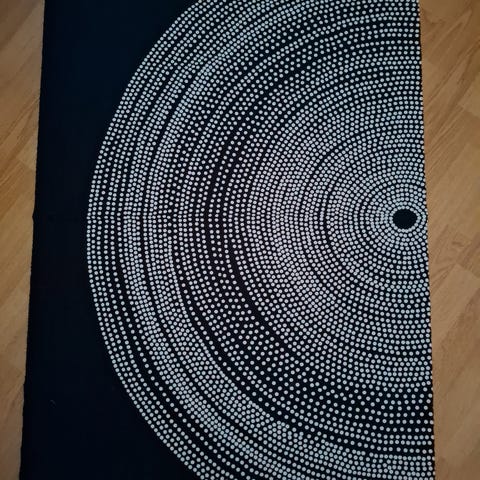 Marimekon Karkumatkalla kangas (kuvassa taitettu leveysuunnasta kahtia). Leveys 145cm ja korkeus 104cm.