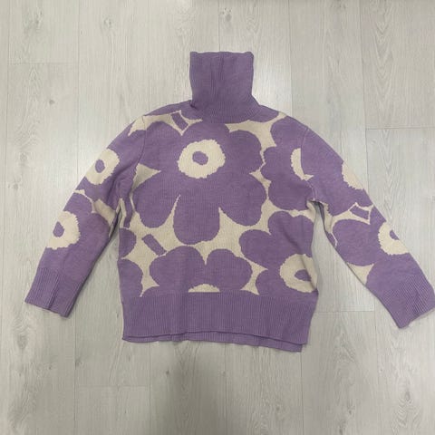 Harvakseltaan käytetty Marimekon Opaakki Unikko villasekoitepaita M. Edessä pieni purkauma/reikä, jonka saa helposti muutamalla pistolla piiloon. Lisäksi edessä jokin tahra, myös kauluksessa meikkivoidetahraa. Helman halkiot ihan aavistuksen purkautuneet. Pientä villanukkaa paikoitellen, lähtee helposti käsin nyppimällä tai villakammalla. Kaikki viat/moitteet kuvattu. Kerran käsin villanpesuaineella pesty.