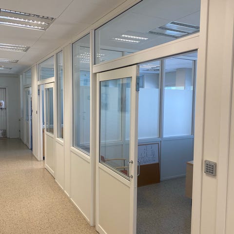 Lasiseinäjärjestelmä toimistokäyttöön. Valkoiset alumiini- tai teräsrunkoiset seinäelementit, joissa yläosassa kirkasta ja osin himmennettyä lasia sekä alaosassa umpiosat. Järjestelmä sisältää lasiaukollisia ovia samoilla kehyksillä. Soveltuu toimistohuoneiden ja neuvottelutilojen kevyisiin väliseiniin sisätiloissa. Mitat ja elementtien määrä tarkennettavissa myyjältä. Lasit käyvät hyvin esm. kasvihuoneeseen. Samoin ovet. Avustamme veloituksetta halaamisessa kolmannesta kerroksesta pihalle. Iso asfalttipiha. Tarvikkeet ovat Vantaan Petikossa.