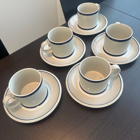 Arabia Ahti kahvikupit ja tassit, molempia 5 kpl. Huom! sama koko ja ulkonäkö, mutta eri leimat pohjassa. Siistit ja ehjät.