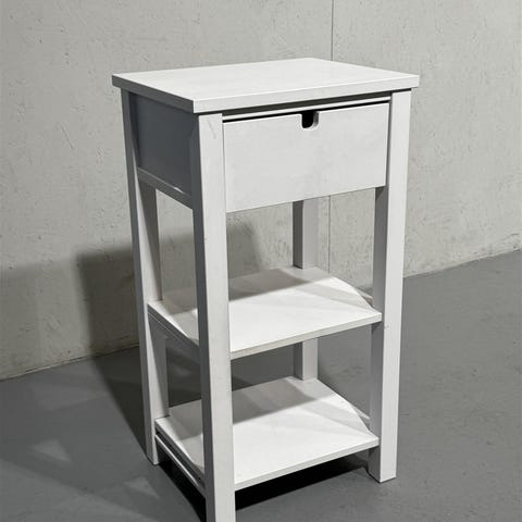 Yksinkertainen mustaksi maalattu puinen yöpöytä, jossa on yksi laatikko ja alahylly. Pöydän pinta on tasainen ja siinä on pieni vedin laatikolle. Pöytä on hyvässä kunnossa ilman näkyviä vaurioita.