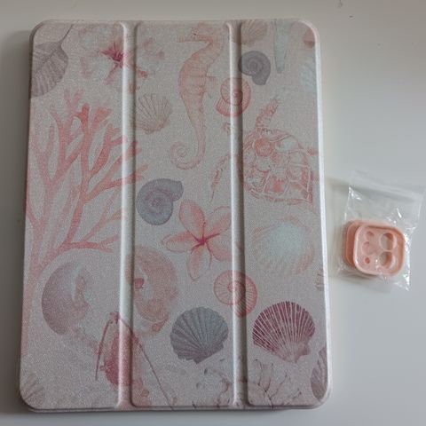 Apple iPad Air suojakotelo. Kotelossa on valkoinen tausta ja kuvitettu pinta, jossa on useita piirroskuvia. Sisäosa on vaalea ja sileä, ja kotelo suojaa sekä näytön että taustan. Kova taustakuori pitää laitteen paikoillaan ja etukansi taittuu näytön suojaksi. Kotelossa on aukot kameralinssille ja liitännöille iPad Air -mallia varten.