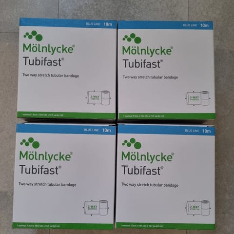 Yli puolet jäljellä. Mölnlycke Tubifast putkisidos on kaksisuuntaisesti joustava putkimainen sidos. Väri on valkoinen, keskellä vihreä merkintäviiva. Rullan pituus on 10 metriä. Soveltuu esimerkiksi sidosten kiinnittämiseen ja ihon suojaamiseen eri kehonosissa. Materiaali on joustava ja mukautuu raajan muotoon.