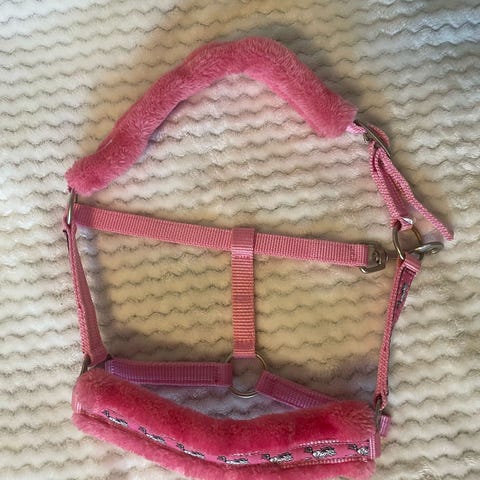 Shettisriimu ponille. Sininen nailonriimu, jossa pehmustetut turpa- ja niskahihnat karvapehmusteella. Edessä ja sivussa glitteriä. Säädettävät hihnat ja metalliset soljet sekä renkaat. Sopii shetlanninponille tai vastaavan kokoiselle ponille. En ole itse käyttänyt, ostin käytettynä.