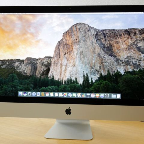Apple iMac pöytätietokone 27" Retina-näytöllä. Laitteessa on Intel Core i5 -suoritin 3,2 GHz kellotaajuudella ja neljällä ytimen kokonaismäärällä. Näytönohjaimena toimii AMD Radeon R9 M390, jossa on 2 Gt VRAM-muistia. Näyttö on 27 tuuman Retina LCD, tarkkuus 5120 x 2880 pikseliä ja 30-bittinen väri. Käyttöjärjestelmänä kuvissa OS X 10.11.6. Mallitunnus iMac17,1. Pieni halkeama näytössä, kuvassa näkyy.