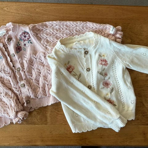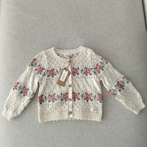 Newbie neuletakki tytöille. Koko 86 cm, koko on reilu ja meillä käytetty koossa 92. Väri vaaleanpunainen. Materiaali puuvillaa. Pitkähihainen, edestä napitettava malli. Neuloksessa on reikäkuviointi ja olkapäillä röyhelöyksityiskohdat. Sopii käytettäväksi esimerkiksi sisävaatteena tai kevyenä lämmikkeenä kerrospukeutumisessa.