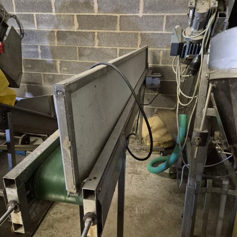 Noin 9,3 metriä pitkä ruostumaton kuljetin. Hihna 30 cm leveä. Runko kahdessa osassa, ollut pulteilla kiinnitettynä. Koteloitu ylhäältä ja alhaalta. Remetin tekemä.