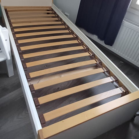 Valkoinen, hyväkuntoinen sänky, patjakoko 80 x 200. Myydään ilman patjaa. Pohjasäleikön nauha katkennut yhdestä kohdasta (kuva).