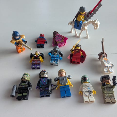 Lapsi myy lego ukkoja/hahmoja. Setti sisältää kuvassa näkyvät hahmot (11 kpl) tarvikkeineen sekä valkoisen lego hevosen. Lapsi on itse kasannut ukot tarvikkeineen eli yhdistelmät eivät varmasti kaikilta osin ole alkuperäisten myyntipakkausten mukaisia 😊