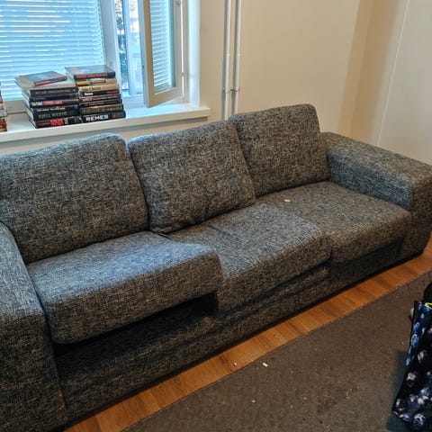 Sohva on tukevaa tekoa,hyvä ja pehmeä istua. Kankaassa kulumista, normaalin käytön jälkiä.