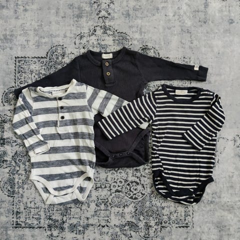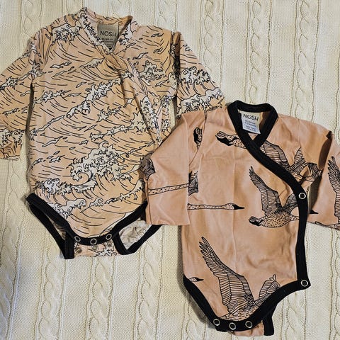 Myydään kaksi Nosh bodya koossa 62/68cm. Tumma hieman haalistunut. Pesty hajusteettomalla pesuaineella.